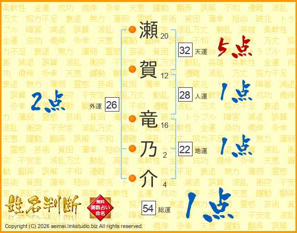 瀬(20画)賀(12画) 竜(16画)乃(2画)介(4画)