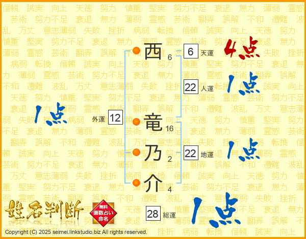 生活面を象徴する運勢です。外部から受ける影響力を表し、結婚運、家庭運や職場、環境への順応性を表します。総運から人運を引いた画数。姓や名が1文字の場合を除く。