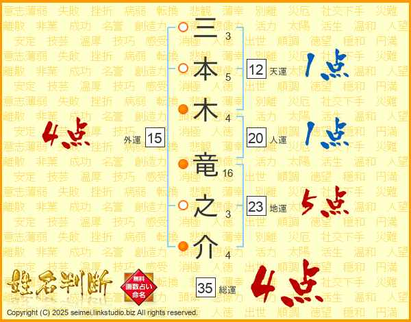 三(3画)本(5画)木(4画) 竜(16画)之(3画)介(4画)
