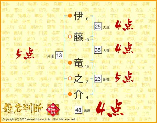 伊(6画)藤(19画) 竜(16画)之(3画)介(4画)
