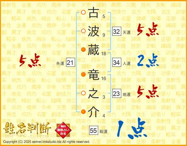 古(5画)波(9画)蔵(18画) 竜(16画)之(3画)介(4画)