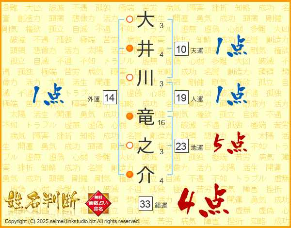 大(3画)井(4画)川(3画) 竜(16画)之(3画)介(4画)