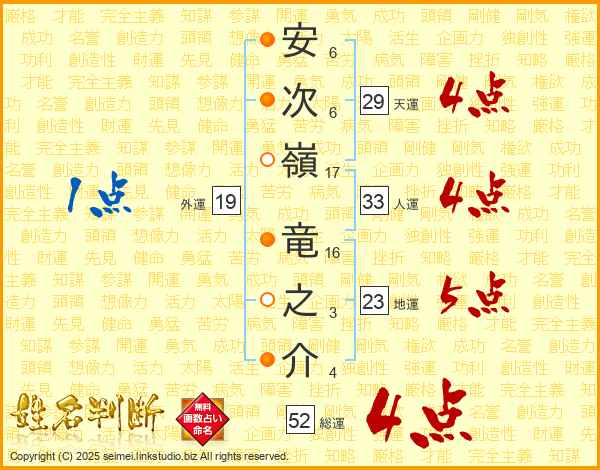 安(6画)次(6画)嶺(17画) 竜(16画)之(3画)介(4画)