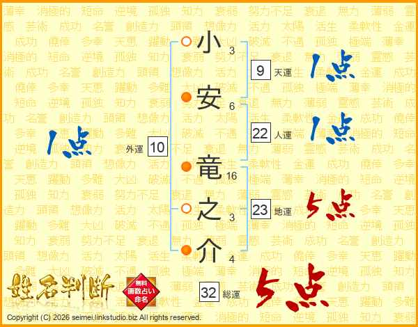 小(3画)安(6画) 竜(16画)之(3画)介(4画)