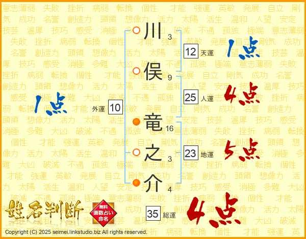 川(3画)俣(9画) 竜(16画)之(3画)介(4画)