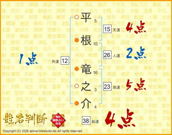 平(5画)根(10画) 竜(16画)之(3画)介(4画)
