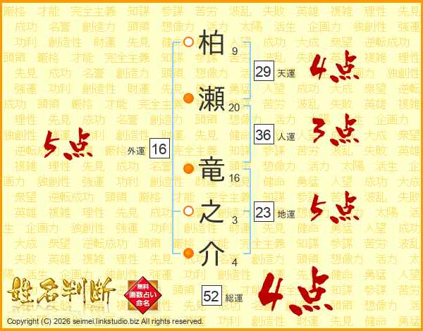 柏(9画)瀬(20画) 竜(16画)之(3画)介(4画)