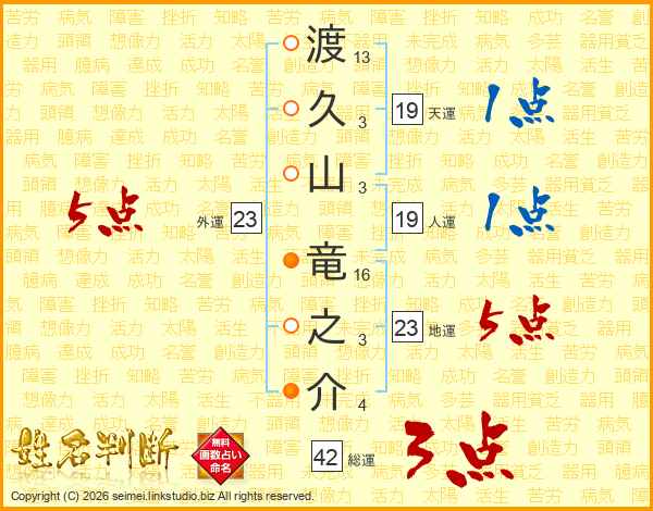 渡(13画)久(3画)山(3画) 竜(16画)之(3画)介(4画)