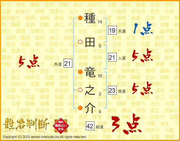 種(14画)田(5画) 竜(16画)之(3画)介(4画)