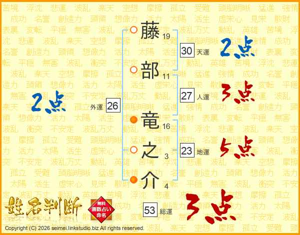 藤(19画)部(11画) 竜(16画)之(3画)介(4画)