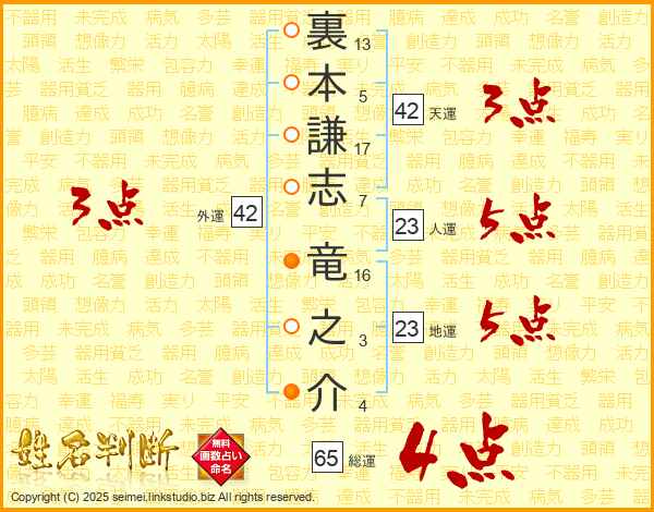 裏(13画)本(5画)謙(17画)志(7画) 竜(16画)之(3画)介(4画)