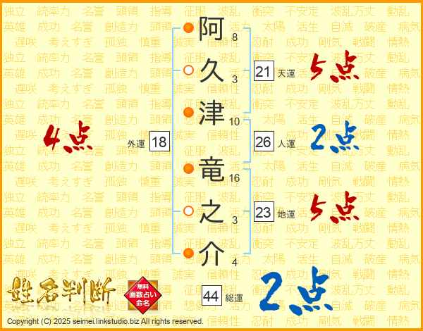 阿(8画)久(3画)津(10画) 竜(16画)之(3画)介(4画)