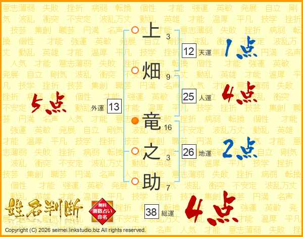 上(3画)畑(9画) 竜(16画)之(3画)助(7画)