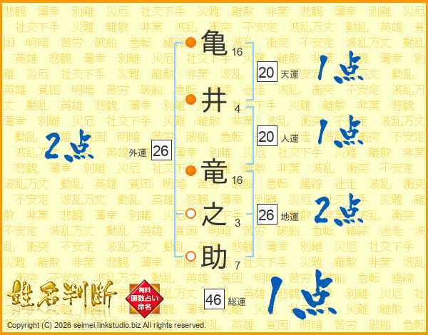 亀井竜之助さんの地運は26画の2点!