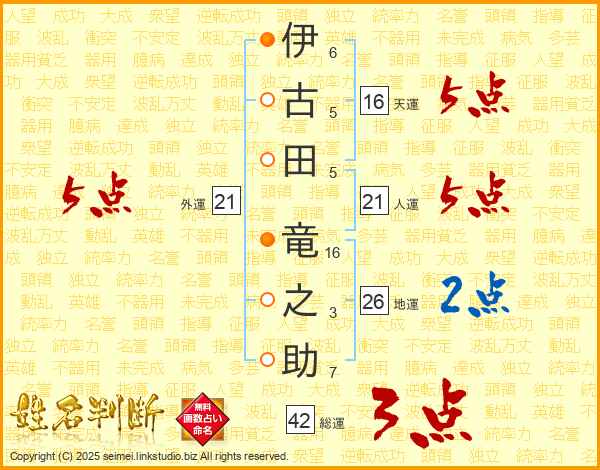 伊(6画)古(5画)田(5画) 竜(16画)之(3画)助(7画)