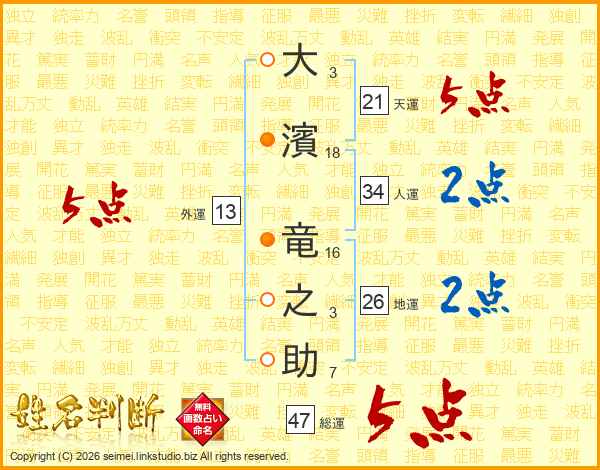 大(3画)濱(18画) 竜(16画)之(3画)助(7画)