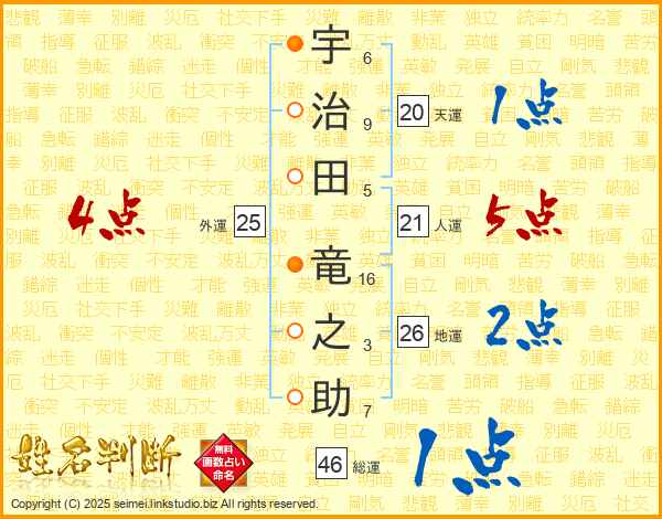 宇(6画)治(9画)田(5画) 竜(16画)之(3画)助(7画)