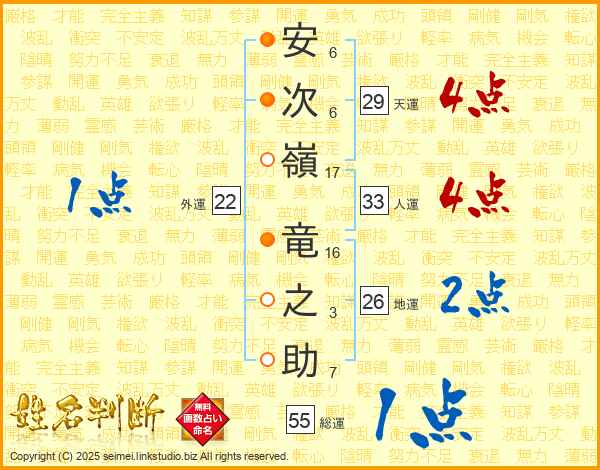 安(6画)次(6画)嶺(17画) 竜(16画)之(3画)助(7画)