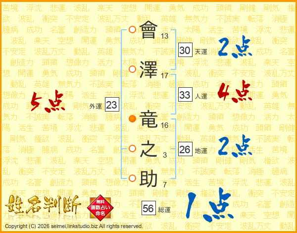 會(13画)澤(17画) 竜(16画)之(3画)助(7画)