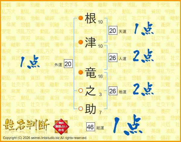 根(10画)津(10画) 竜(16画)之(3画)助(7画)