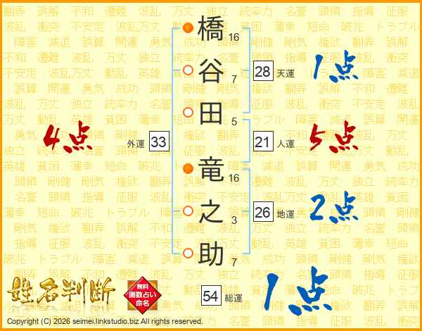 橋(16画)谷(7画)田(5画) 竜(16画)之(3画)助(7画)