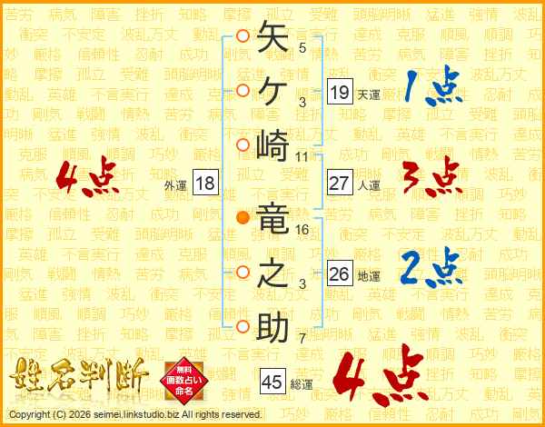 矢(5画)ケ(3画)崎(11画) 竜(16画)之(3画)助(7画)