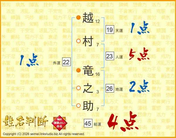 越(12画)村(7画) 竜(16画)之(3画)助(7画)
