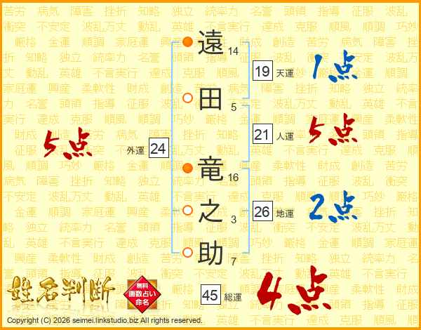 遠(14画)田(5画) 竜(16画)之(3画)助(7画)
