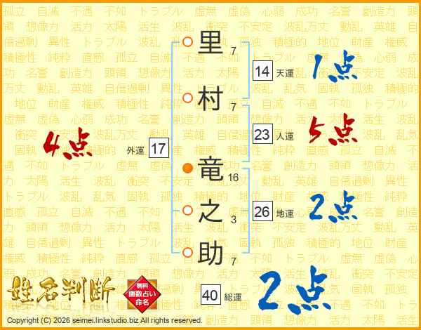 里(7画)村(7画) 竜(16画)之(3画)助(7画)