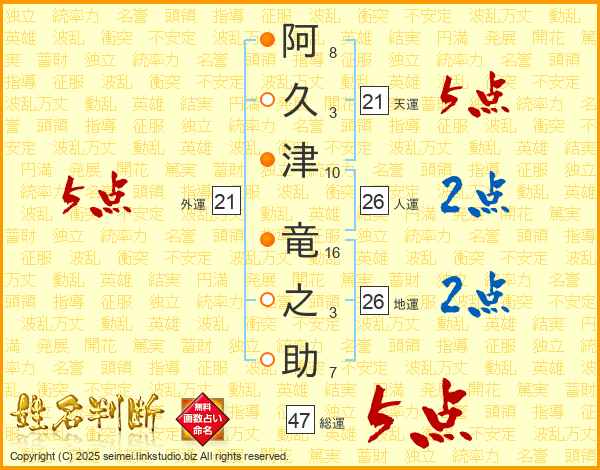 阿(8画)久(3画)津(10画) 竜(16画)之(3画)助(7画)