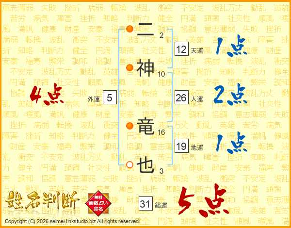 生活面を象徴する運勢です。外部から受ける影響力を表し、結婚運、家庭運や職場、環境への順応性を表します。総運から人運を引いた画数。姓や名が1文字の場合を除く。