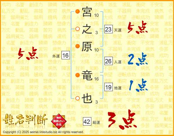宮(10画)之(3画)原(10画) 竜(16画)也(3画)