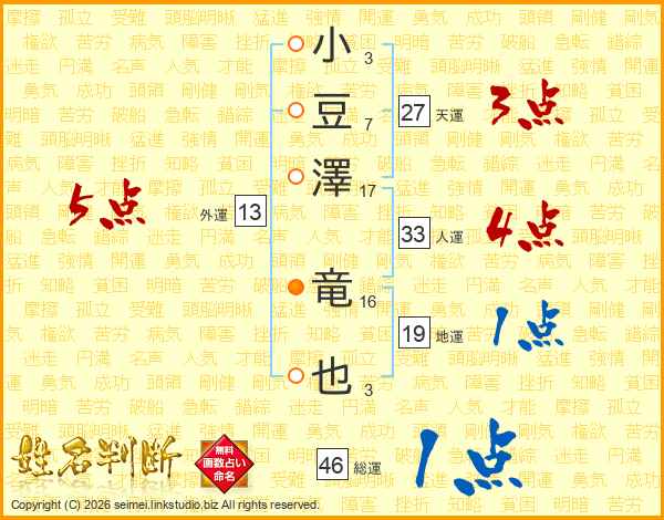 小豆澤竜也さんの総運は46画の1点!