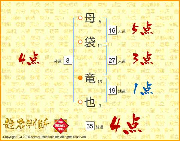 母袋竜也さんの天運は16画の5点!