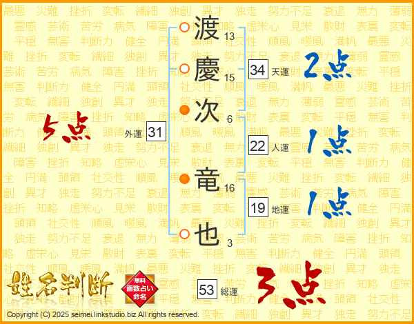 渡(13画)慶(15画)次(6画) 竜(16画)也(3画)