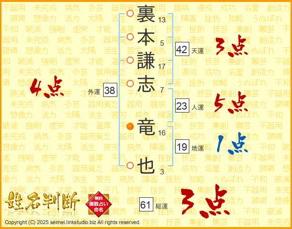 裏本謙志竜也さんの総運は61画の3点!