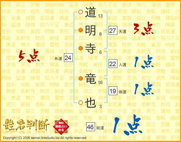 道(13画)明(8画)寺(6画) 竜(16画)也(3画)