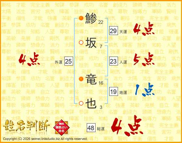 鯵坂竜也さんの天運は29画の4点!