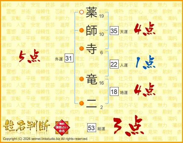 薬師寺竜二さんの総運は53画の3点!