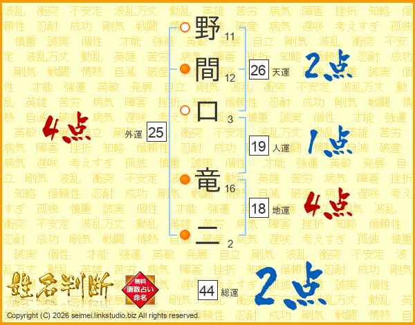 野(11画)間(12画)口(3画) 竜(16画)二(2画)