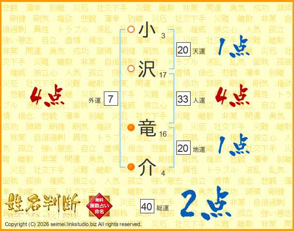 生活面を象徴する運勢です。外部から受ける影響力を表し、結婚運、家庭運や職場、環境への順応性を表します。総運から人運を引いた画数。姓や名が1文字の場合を除く。