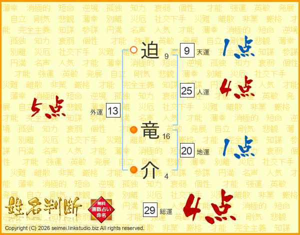 家系が持つ宿命的な運勢を表します。祖先から受け継いだ苗字ですので自分の力が及びません。家柄を象徴します。苗字の合計画数。