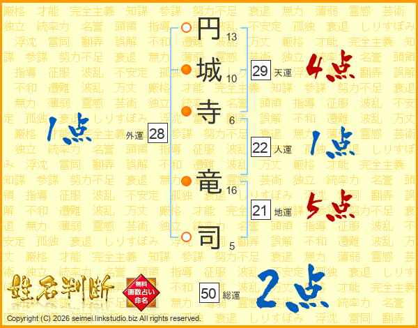 円(13画)城(10画)寺(6画) 竜(16画)司(5画)