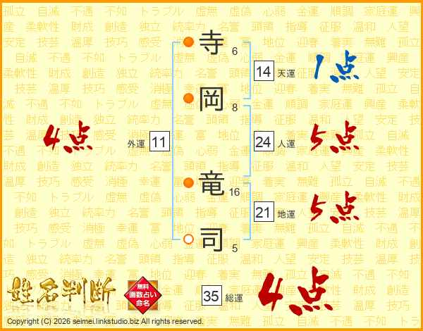 寺(6画)岡(8画) 竜(16画)司(5画)