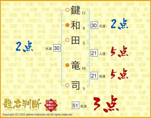 鍵(17画)和(8画)田(5画) 竜(16画)司(5画)