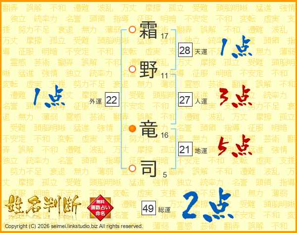 霜野竜司さんの総運は49画の2点!