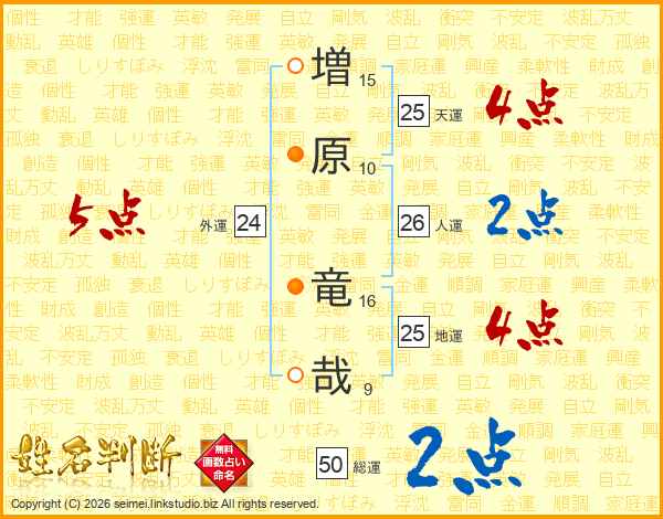 増(15画)原(10画) 竜(16画)哉(9画)