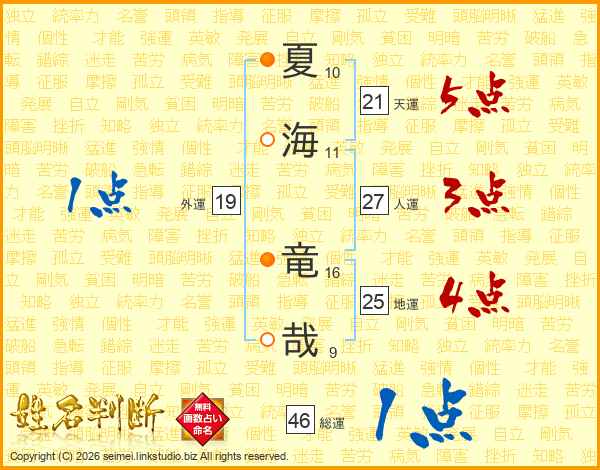 夏(10画)海(11画) 竜(16画)哉(9画)