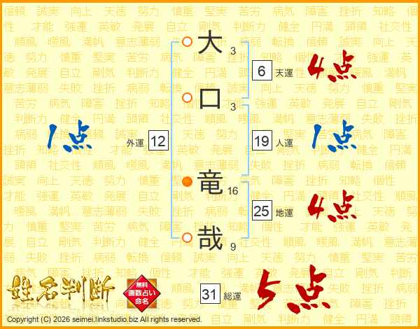 大(3画)口(3画) 竜(16画)哉(9画)