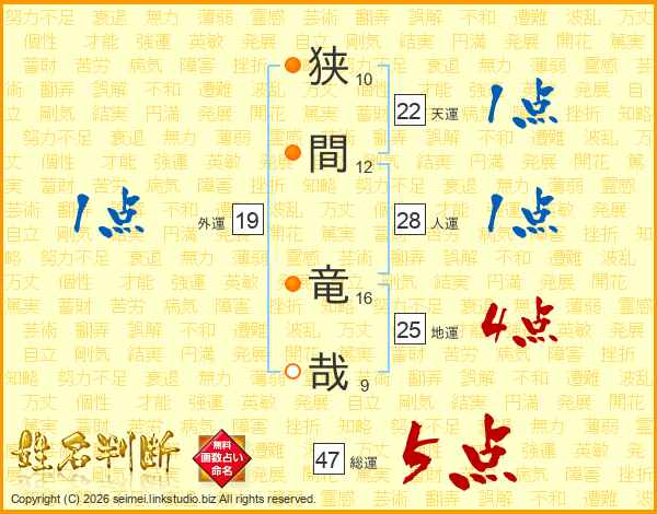 狭間竜哉さんの総運は47画の5点!